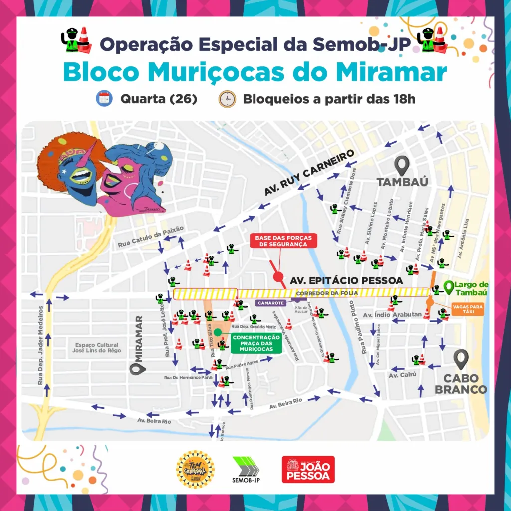Bloqueio e desvios – A Via Folia, no trecho a partir da bifurcação com a Av. Rui Carneiro e Av. Tito Silva, será bloqueada no sentido Centro-praia a partir das 10h, com as equipes operacionais orientando o posicionamento dos trios elétricos. Às 18h, com o aumento da demanda de foliões, irão ocorrer as intervenções e os desvios para o bloqueio total do corredor da folia, incluindo a Praça das Muriçocas, com proibição de acesso dos veículos particulares e do transporte coletivo.